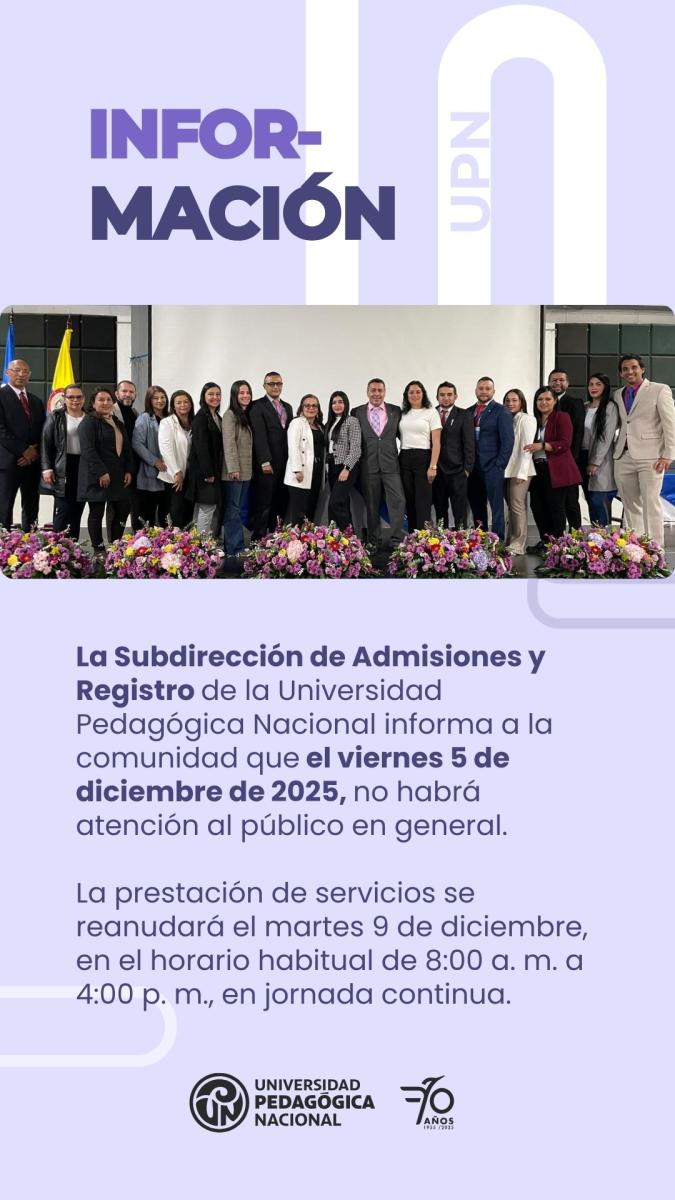 La subdirección de Admisiones y Registro Informa a la comunidad universitaria y al público en general que, no se prestará atención presencial ni virtual durante la jornada del viernes 5 … Leer más …