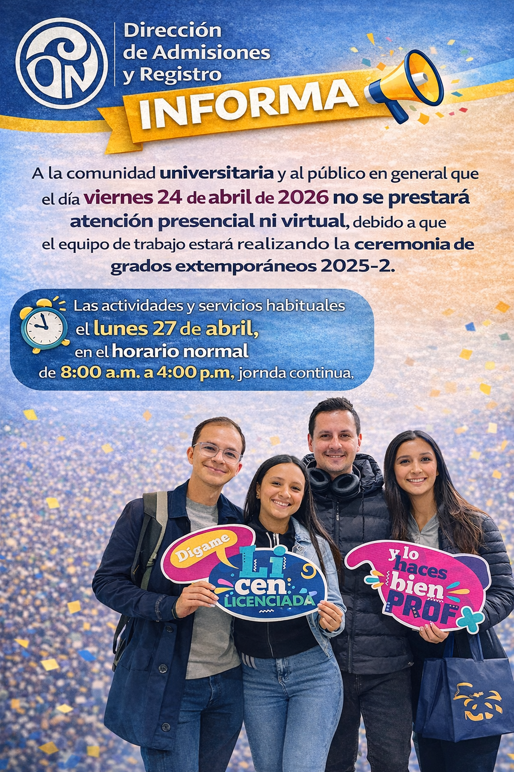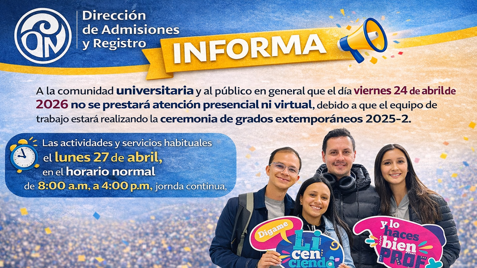 La Dirección de Admisiones y Registro informa a la comunidad universitaria la publicación de la lista de graduandos extemporáneos del período académico 2025-2 de los programas de pregrado y posgrado, … Leer más …