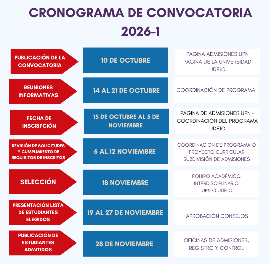 Los estudiantes admitidos deberán en la Universidad Pedagógica Nacional realizar el procedimiento establecido y publicado AQUÍ ![]()
