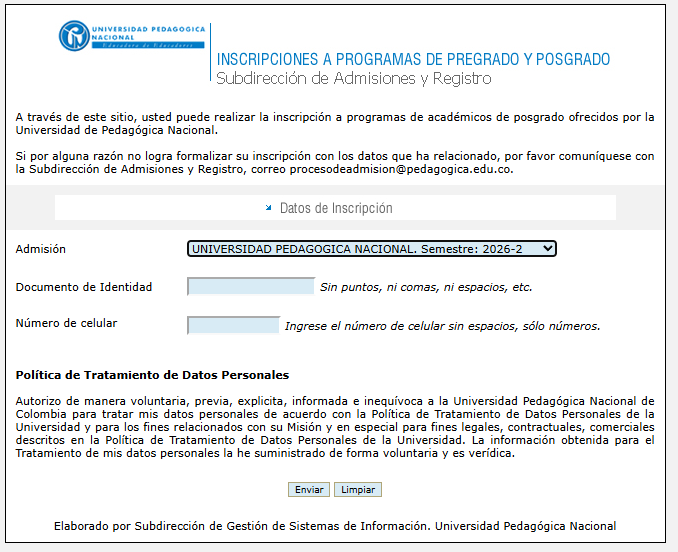 La inscripción a programas de posgrado (Especialización y Maestría) de la Universidad Pedagógica Nacional es GRATUITA y solo requiere diligenciar el formulario de inscripción