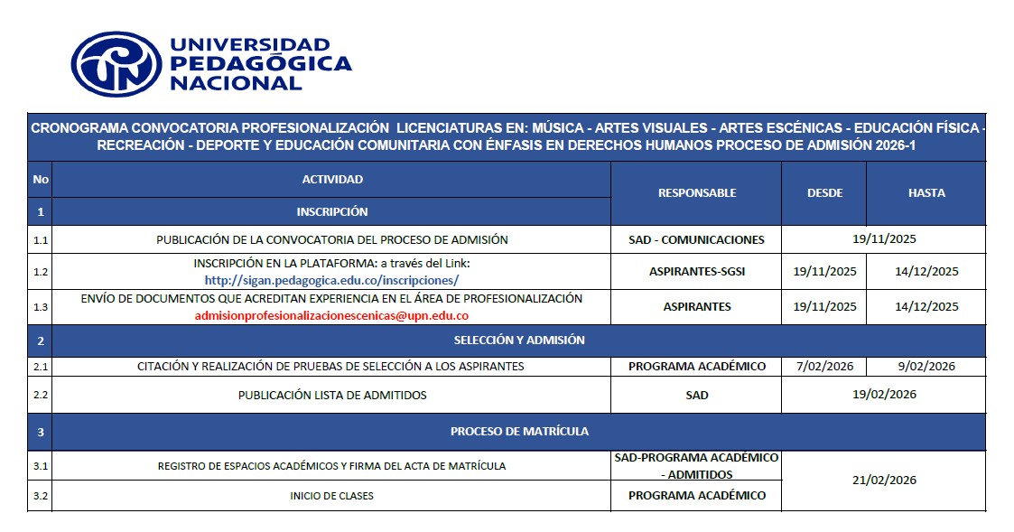NOTA IMPORTANTE: Los procesos señalados en este cronograma, se deben realizar en las fechas establecidas por la Universidad, para mayor información y en caso de tener alguna duda frente al proceso puede comunicarse a la Subdirección de Admisiones y Registro de la Universidad Pedagógica Nacional, a continuación, datos de contacto.
