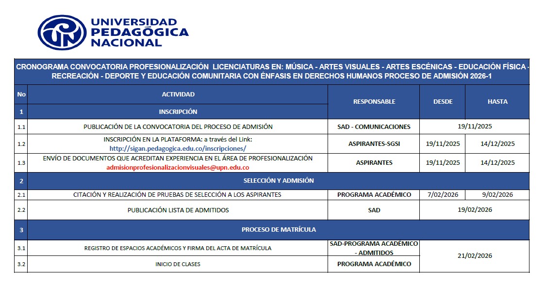 NOTA IMPORTANTE: Los procesos señalados en este cronograma, se deben realizar en las fechas establecidas por la Universidad, para mayor información y en caso de tener alguna duda frente al proceso puede comunicarse a la Subdirección de Admisiones y Registro de la Universidad Pedagógica Nacional, a continuación, datos de contacto.