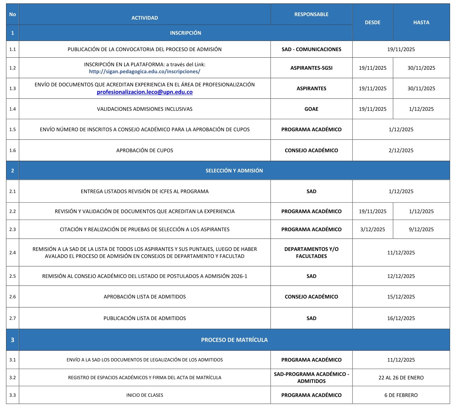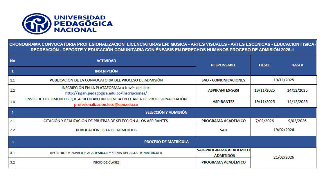 NOTA IMPORTANTE: Los procesos señalados en este cronograma, se deben realizar en las fechas establecidas por la Universidad, para mayor información y en caso de tener alguna duda frente al proceso puede comunicarse a la Subdirección de Admisiones y Registro de la Universidad Pedagógica Nacional, a continuación, datos de contacto.