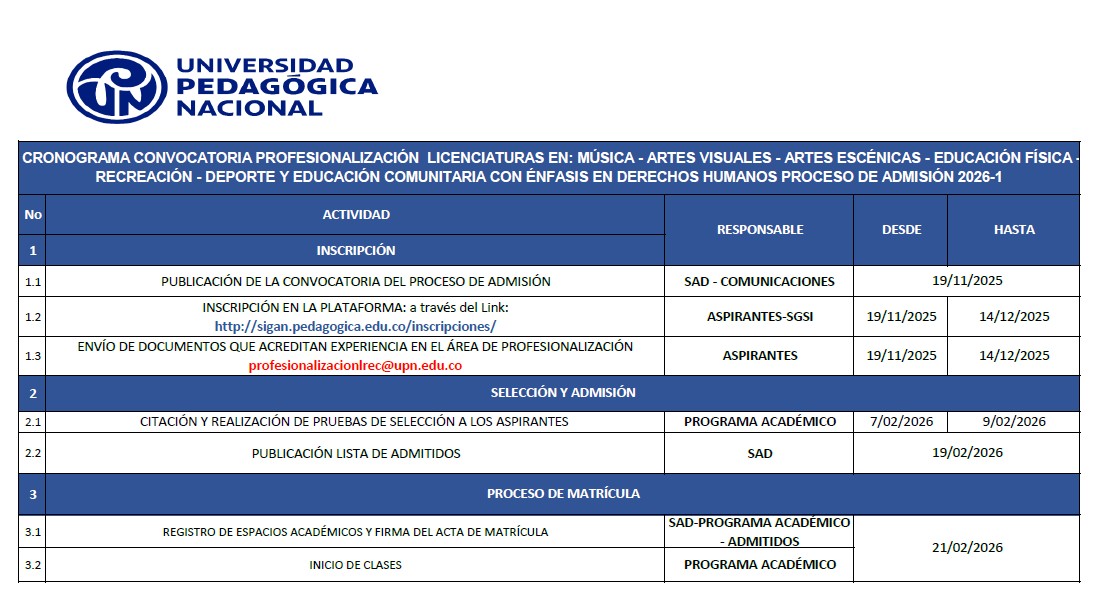 NOTA IMPORTANTE: Los procesos señalados en este cronograma, se deben realizar en las fechas establecidas por la Universidad, para mayor información y en caso de tener alguna duda frente al proceso puede comunicarse a la Subdirección de Admisiones y Registro de la Universidad Pedagógica Nacional, a continuación, datos de contacto.